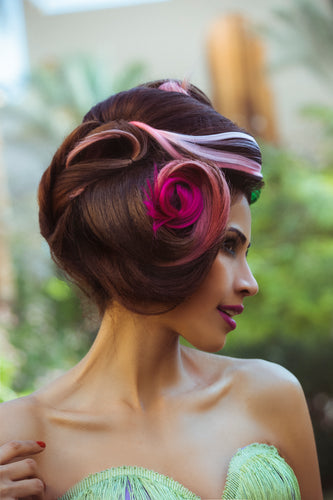 Colorful High Fashion Flowers Hair Style of A Brunette Female Model