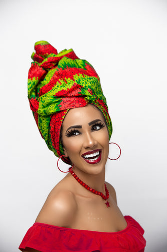 Happy Laughing African Fair Woman Wearing A Culture Head Wrap Beauty Shoot With Make Up Red Lipstick