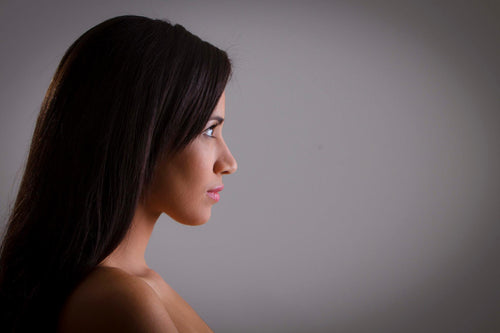 Brunette Model Looking To Sunlight For Hope With Grey Wallpaper Background