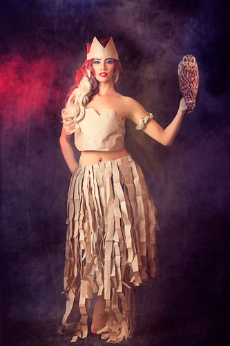 Female Model Wearing Cool Handmade Designed Paper skirt and shirt nice outfit o a dark wall background